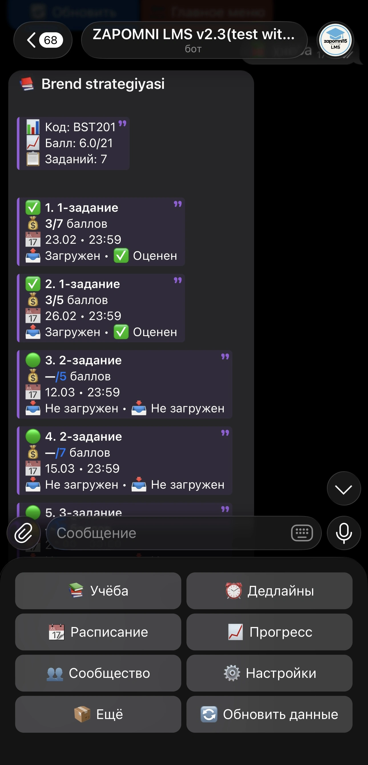 Автоматический мониторинг оценок и дедлайнов — чтобы вы ничего не пропустили.